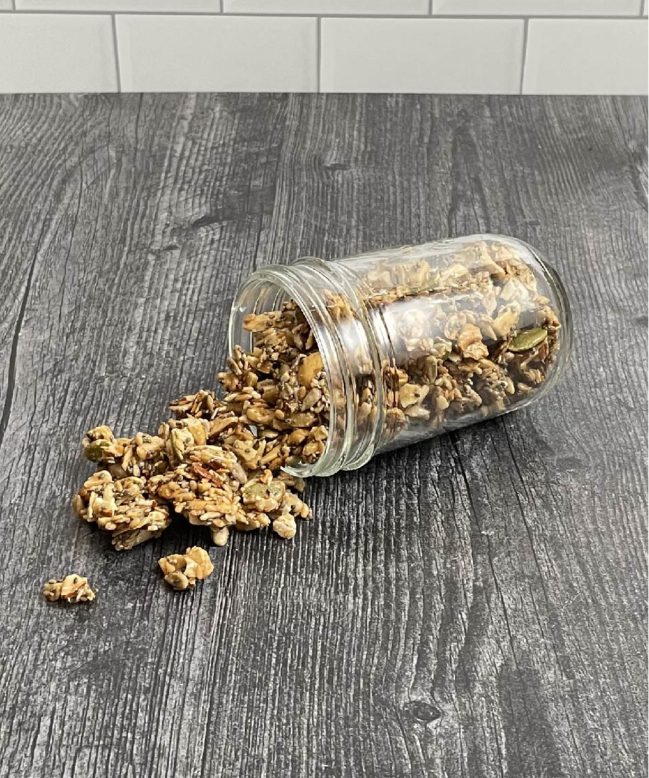 Chunks of blueberry granola, perfect for an on-the-go snack or an addition to your favorite breakfast foods! This is also sugar free, gluten free, keto friendly, and vegan.