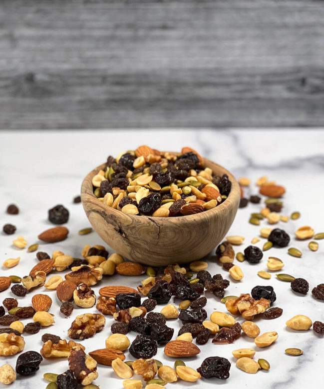 Peanuts, Raisins (Raisins, Sunflower Oil), Walnuts, Cranberries (Cranberries, Sugar, Sunflower Oil), Almonds, Pepita Seeds (Pumpkin Seeds, Salt, Oil).