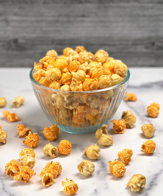Sugar, Corn Syrup, Popcorn (popcorn seed, coconut oil, salt), Brown Sugar, Butter (Cream, Salt (Dairy)), Salt. Cheese Flavoring (Palm Oil, Hydrogenated Coconut Oil, Cheddar and Blue Cheese (Pasteurized Milk, Cheese Culture, Salt, Enzymes), Whey, Salt, Maltodextrin, Soybean Oil, Sodium Phosphate, Natural Flavors, Nonfat Dry Milk, Buttermilk, Citric Acid, FD&C Yellow #5, FD&C Yellow #6.